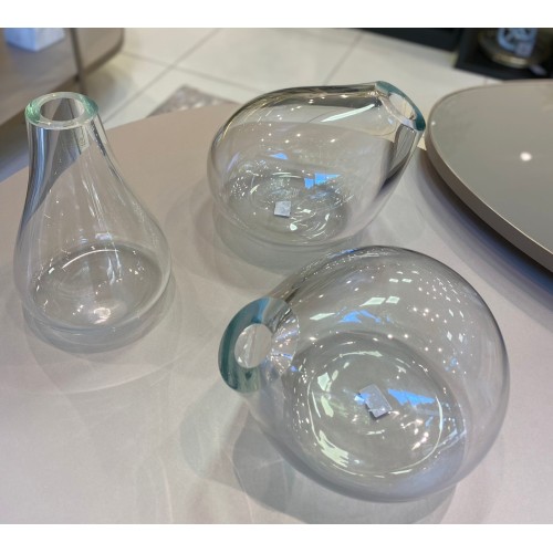 O design desse vaso organico destaca-se por sua forma fluida e contemporânea, que lembra as linhas suaves de uma gota d'água. Feito à mão por artesãos habilidosos de Murano, cada vaso é uma obra-prima única, exibindo a transparência pura e cristalina do vidro de Murano, valorizando qualquer ambiente onde seja colocado.