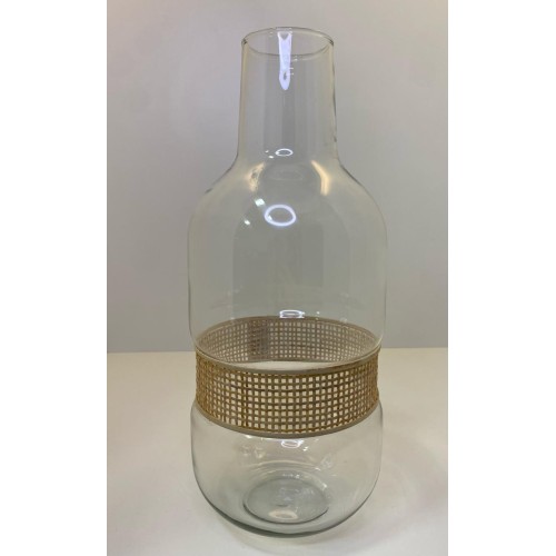 Vaso feito em vidro, com detalhes em palha. Dimensões: Alt.:27cm Diam.:13c..