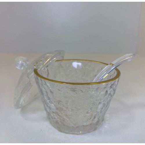 Açucareiro de cristal ecologico martelado, com detalhes na borda em dourado.